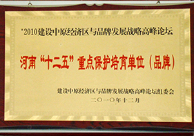 | 河南“十二五”重点保护培育单位 | 建设中原经济区域品牌发展战略高峰论坛组委会 | 2010年 |