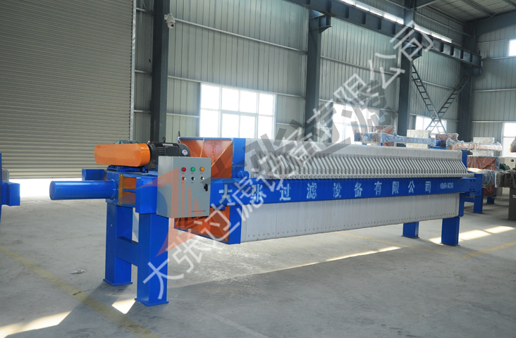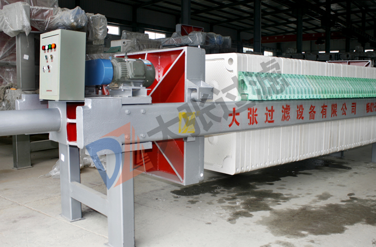 机械压紧压滤机启动电机,通过减速机带动丝杠转动推动头板移动,压紧滤板,然后用锁紧螺母锁紧。用泵将待过滤的悬浮液输送至已压紧的各个滤室中,悬浮液中的液体透过滤布,通过各滤板上的滤液孔排至机外,悬浮液中的固体颗米立积聚于滤室中,逐渐形成滤饼,滤饼充满滤室,即完成一个过滤循环。如使用双隔膜滤板,可在进料结束后,向橡胶膜内通入压缩空气,使隔膜鼓胀,压榨滤饼,使滤饼内水分进一步溢出。